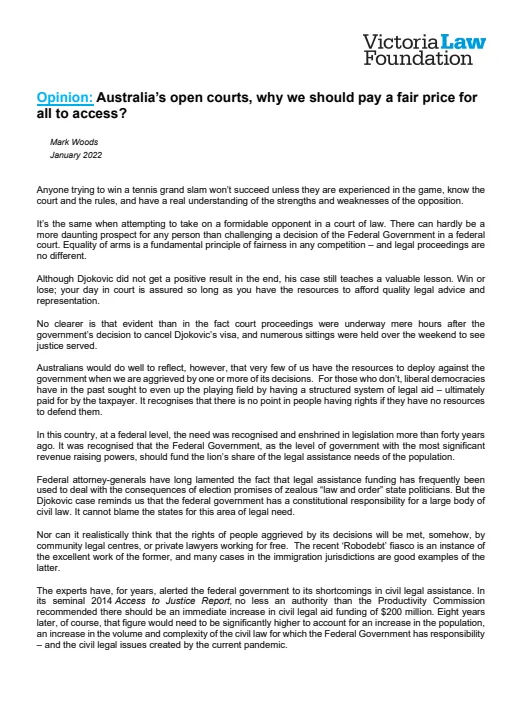 Opinion piece discussing how the latest Djokovic case reveals flaws in the Federal Government's funding to the civil justice system and how this affects access to justice.