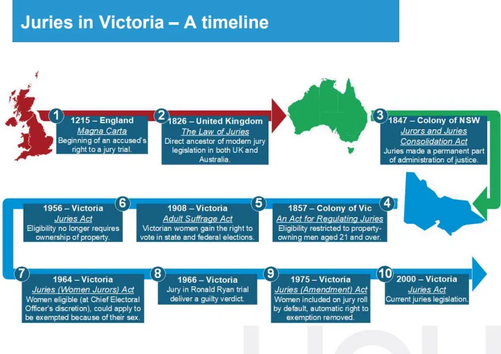 These three pages are a great handout for students, and civics learners alike. They detail the way in which jurors are selected, the history behind the development of Victoria's jury system - and all the jury electorates.