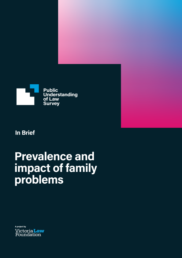 Prevalence and impact of family problems and Resolution and outcomes of family problems investigate how Victorians experience and resolve their family problems, drawing on data from the Public Understanding of Law Survey (PULS).